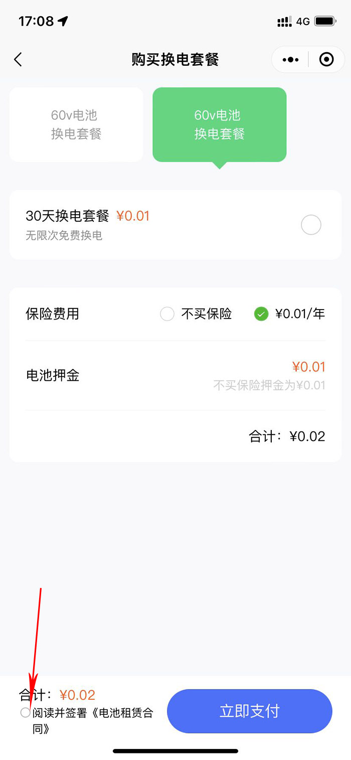 三、請仔細(xì)閱讀合同協(xié)議,并簽署姓名。簽署完協(xié)議后,再繳納電池押金以及換電套餐費(fèi)用。